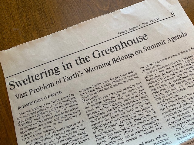 The other night I went into my office and found myself opening a file drawer I rarely look in. My hand went right to a file marked “News Clippings, Environment.” I pulled it out and leafed through the yellowed clippings, mostly from the Los Angeles Times, a few from The Guardian when I lived in the UK. The earliest clipping was from the August 1, 1986 edition of the Los Angeles Times. The headline of the op-ed piece was “Sweltering in the Greenhouse: Vast Problem of Earth’s Warming Belongs on Summit Agenda” by James Gustave Speth, then president of the World Resources Institute. What summit was he writing about? The US and the Soviet Union—now there’s a term you haven’t heard in a while—were due to meet in October. This would be a good opportunity for the then Great Powers to discuss the existential threat of climate breakdown, which Speth presciently pointed out we would “probably” start to see in 20 years.